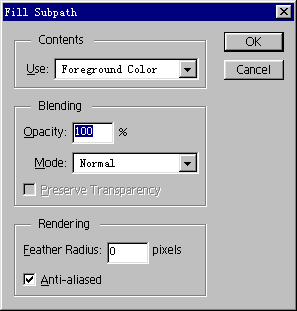 如果需要进行填充设置,则可以在按住键盘的ALT键的同时,点取此填充路径工具图标,则在填充前首先会弹出一个设置窗口,用于设置填充的相应属性。此对话窗口如下图所示。