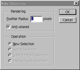 在MAKE SELECTION对话窗口中,有两大组设置项,其中FEATHER RADIUS项用于设置羽化的范围,其设置单位为像素,ANTI-ALIASED选项则决定在转换过程中是否使用抗锯齿功能,位于第二部分的是OPERATION选项组,只有在当前图像中已经存在选择区域时才全部有效,此设置决定着给转换后所得到的选择区域与原选的选择区域如何合成,总共有四个子选项: