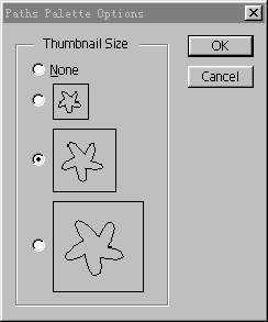 设置剪切路径这是菜单中所独有的功能,CLIPPING PQTH用于将用户选定的某条路径作为此图像的剪切路径,这样的一个图像文件便具有类似透明效果的特性。即位于剪切路径以外的区域被透明,这一特性使得类似的图像在被导入PAGEMAKE等排版软件中进行排版时,可具有已抠除背景图像的特性。CLIPPING PATH命令时,将出现CLIPPING PATH 设置窗口,其中的PATH选项,用于指定所使用的路径来源于哪一个路径层,而FLATNESS选项则决定在多大的像不误差允许下进行剪切路径的简化工作,这样可以防止剪切路径过于复杂。 路径层缩图显示选项 用于设置路径控制面板中的路径层缩图显示大小。