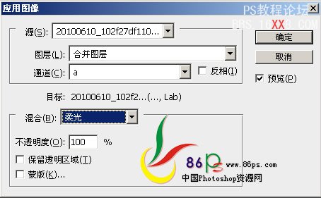 4、执行图像——应用图像,应用a通道,混合:柔光。