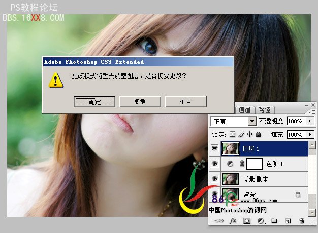 3、按Ctrl+Alt+Shift+E盖印图层,然后转到LAB模式(图像—模式—LAB颜色),弹出提示,确定。
