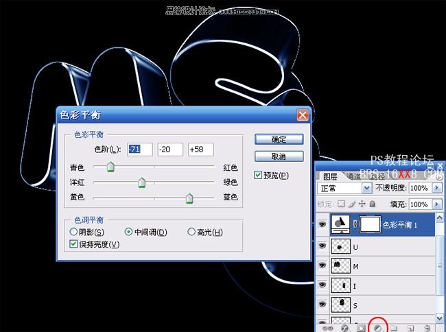 6、添加调整色彩平衡图层,设定中间调数值(见图示)
