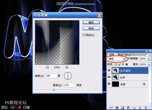 9、复制合并的图层,改为“滤色”。滤镜-模糊-动感模糊。