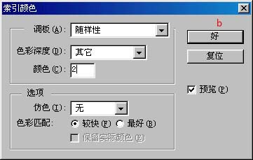 2.用photoshop将图片打开,将图片模式改变为索引模式,改成如图b的设置。怎么样,图片是不是只有两种颜色了?这样才能便于色彩的选择。