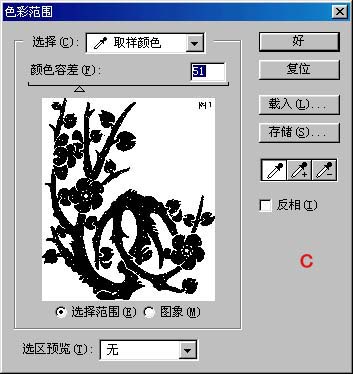3.在色彩范围里用吸管吸取梅花外面任意一个地方,如图c,按“好”按钮