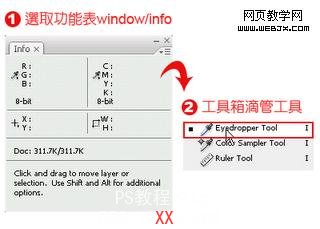 随着数位时代的来临,数位相机已是大家所具备的3C电子产品,因此也大幅的降低拍照的门槛,凡只要相机在手、卡兹无穷,想拍那就拍那,拍的让你浑然忘我,但回家正兴高采烈的看今日所拍摄的成果时,才发现照片怎么一下蓝一下黄,有经验的老手二话不说马上就开启Photoshop进行校色的动作,没经验的新手只好按Del等下次有缘相见时再拍啰! 但大部分的老手也都只能凭个人的色感,偏什么色就补什么色,完全只能意会而无法言传,但此篇无论是老手或新手皆适用,透过数值让你也能轻松的学会校色的技巧与方法,校色也是可以言传的。 说明: 首先,先跟各位解释一下什么是三点校色法,这个名词非专有名词,而是梅氏教学的独家说法罢了,但这三点校色也非完全无依据,之所以会命名为三点校色的原由在于,透过照片的亮面、暗面以及中间色调等三点资讯来作校色。7.0、CS、CS2、CS3 适用版本: 实例演练: Step1. 开启功能表window/Info面板(F8),再选取工具箱中的滴管工具(i)。 Step2.