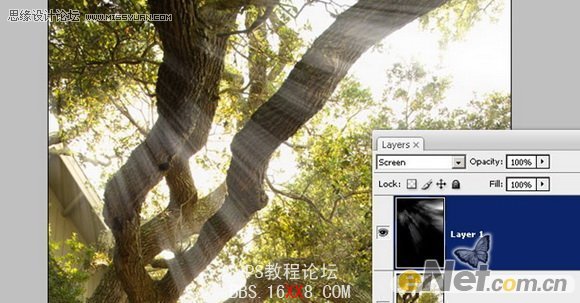 使用画笔工具,将前景色设置为黑色,在树干上涂抹,将光线不应该照射的地方的光线,涂抹掉。