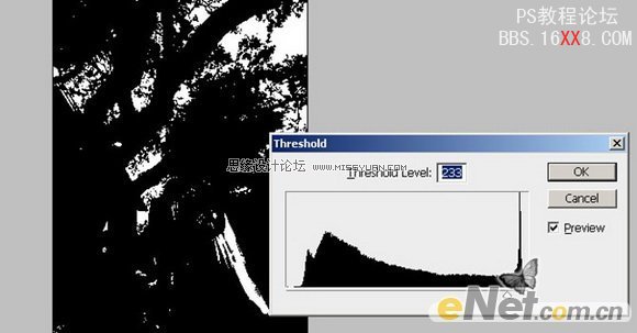 3. 请确保您已选定最顶层图层。选择“图像”>“调整”>“阈值”。创建一个100%的黑白图像(无灰色)。我们将使用此工具来帮助我们分开的天空和前景。 在阈值工具里,利用滑块。然后,移动滑块向右边,直到天空出现白色。一旦出现,然后点确定。