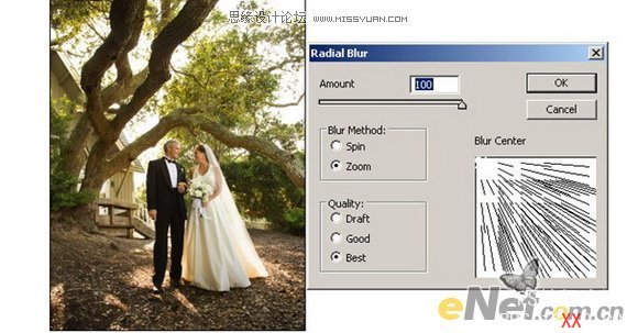 6. 下面我们添加光线。选择“滤镜”>“模糊”>“径向模糊”。径向模糊滤镜可以创建一个从任何方向的投射效果。在径向模糊滤镜,设置达100%,模糊方法变焦,质量最好。