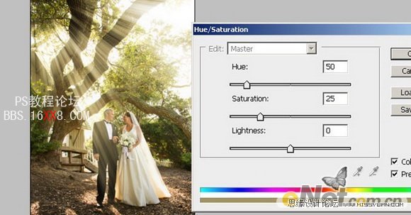 按Ctrl + U或选择“图像“>“调整”>“色相/饱和度”。在色相/饱和度窗口,勾选“着色”选项。然后,调整色调和饱和度,使光芒的色彩和环境相融。