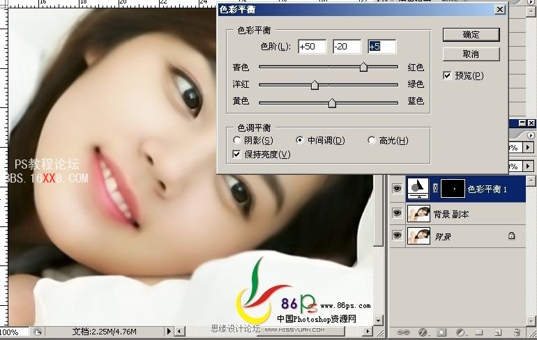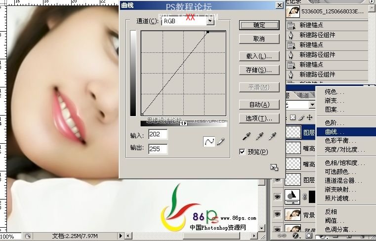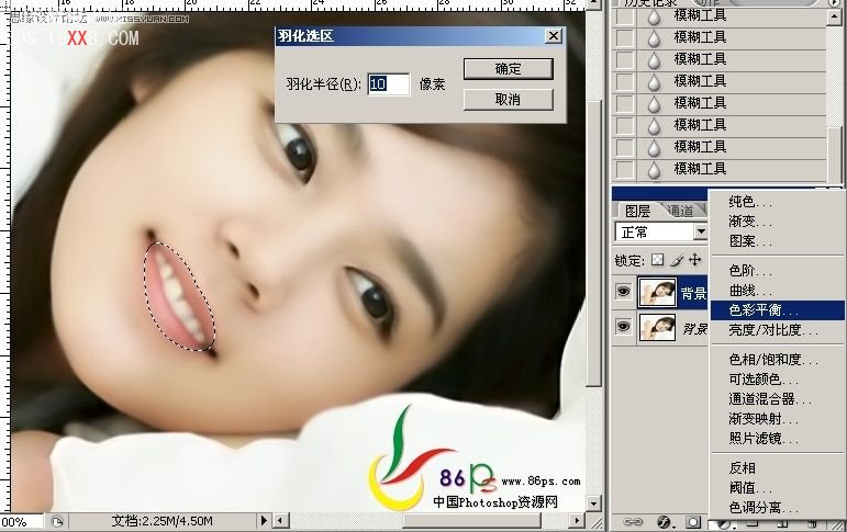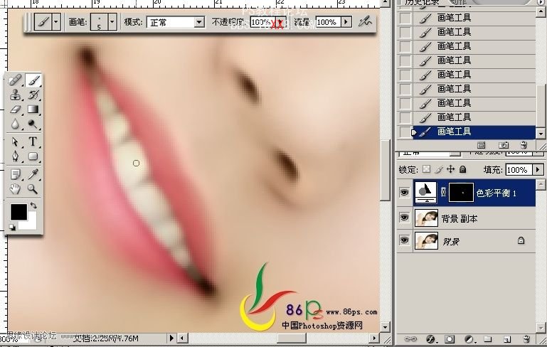 7、选择画笔工具,前景设为黑色,将超出嘴唇以外的颜色在蒙版里擦去。看图: