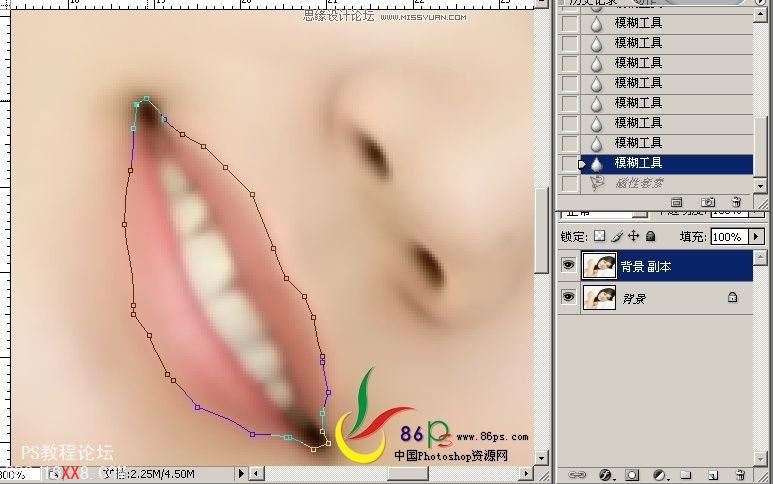 4、我喜欢先做嘴巴。用工具将嘴巴选出来,我用的索套工具,选得不精确也没关系,后面会处理。