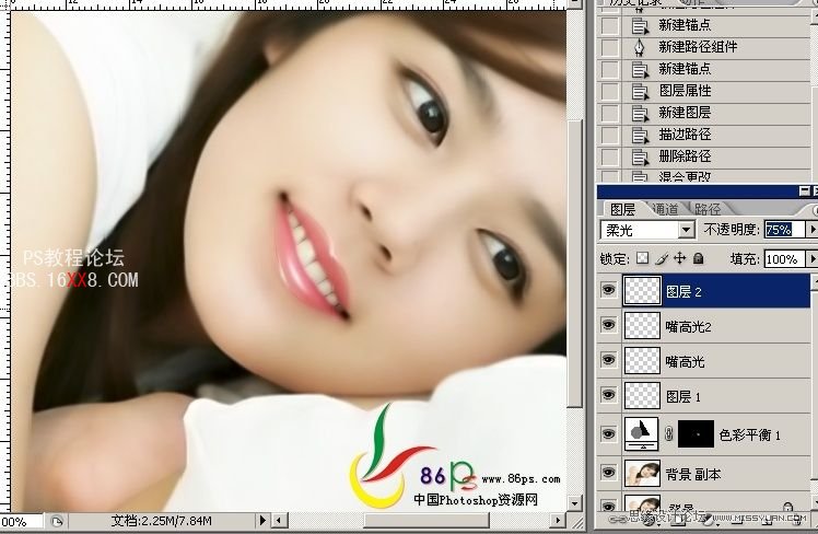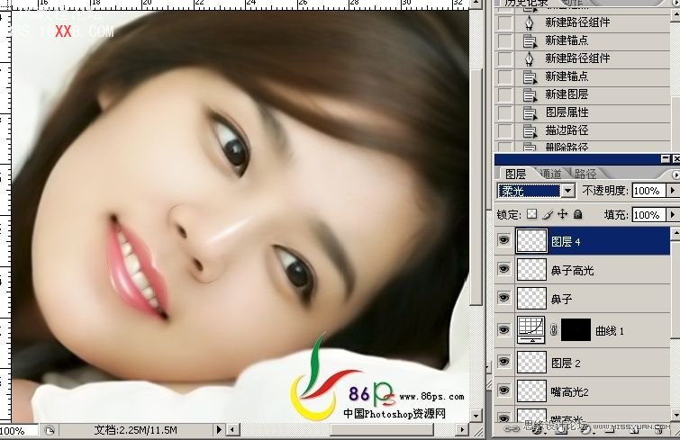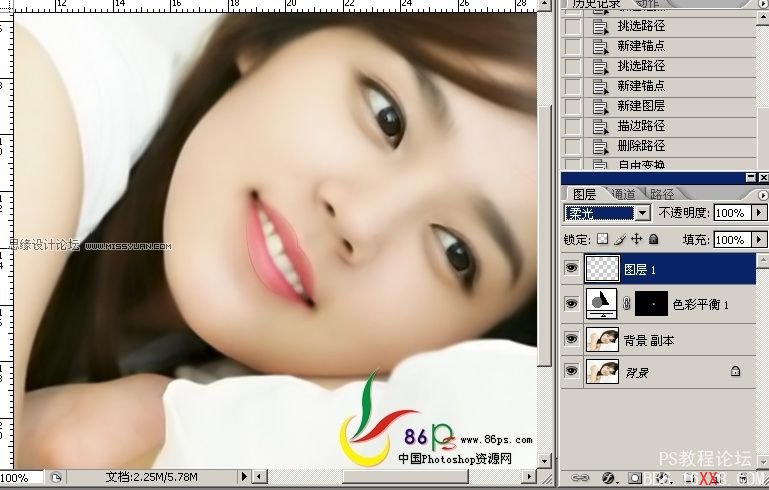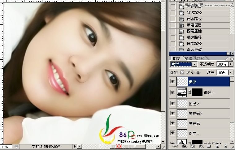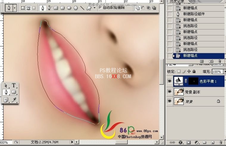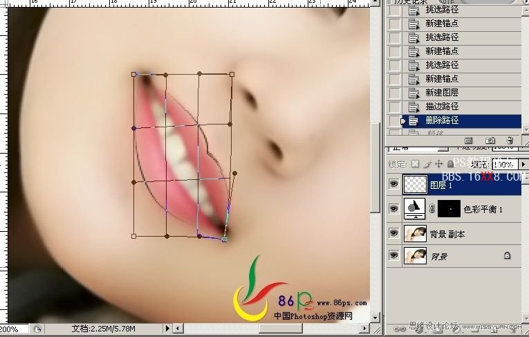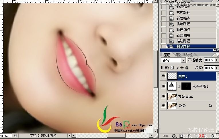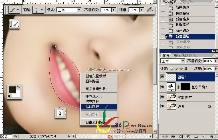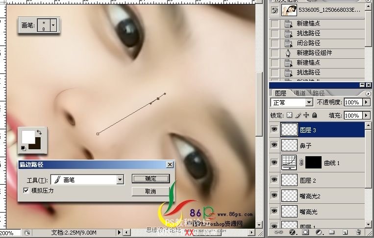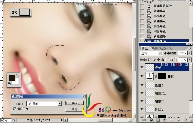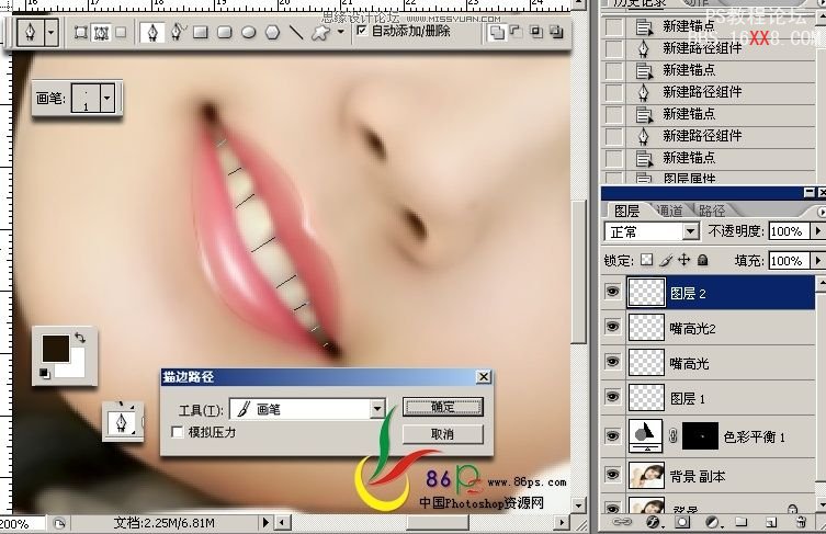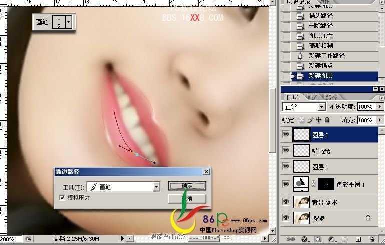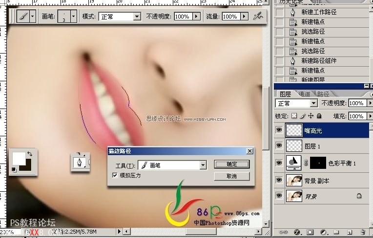 14、用钢笔工具勾出唇上的高光路径,这次画笔设大一点点,3像素,前景用白色,新建图层,点右键—描边。
