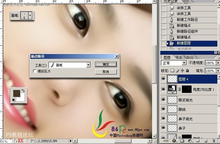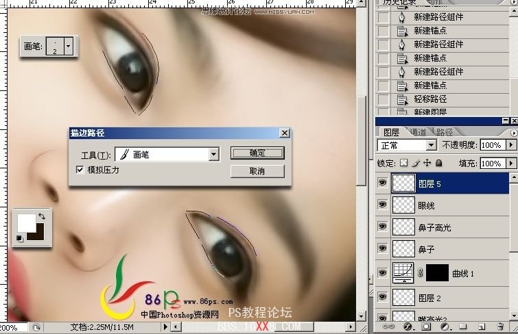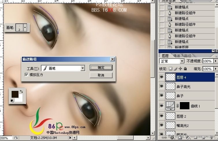 26、勾出眼线和双眼皮路径,画笔大小设为2像素,新建图层,描边。