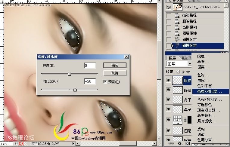 30、用索套工具选出眼珠,调整亮度/对比度,使眼睛更有神。