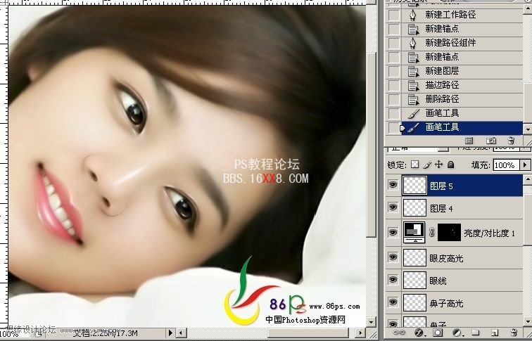 16、再画下嘴唇的高光,这次画笔设为5像素,建图层,点右键—描边。