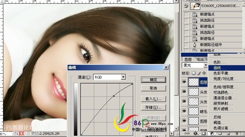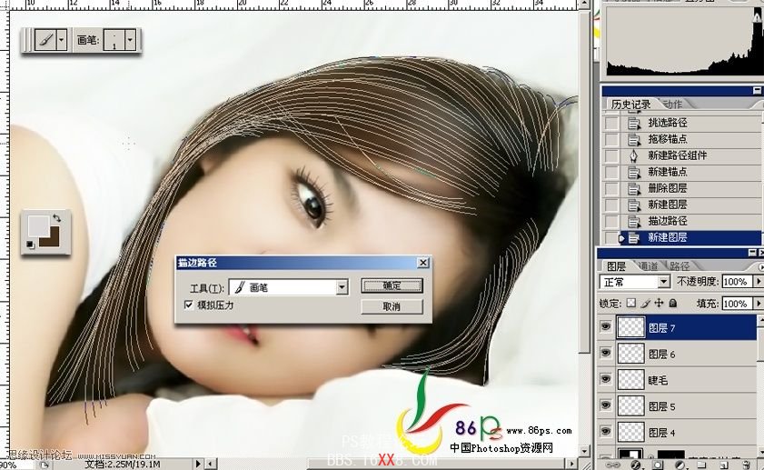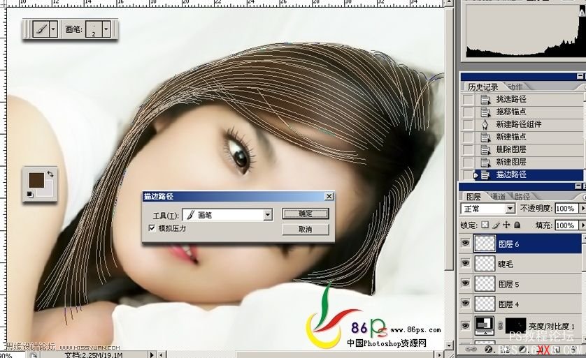 35、画头发,注意头发的层次,我也是第一次画,把路径全画好先,再新建图层,描边,画笔设为2像素,勾选模拟压力。
