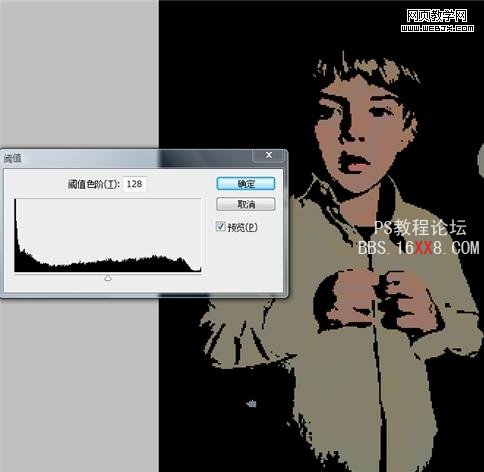 选择最顶部的图层,打开阈值工具(图像>调整>阈值)。左右移动滑杆以调整效果,假如默认值128已经足够好,你只需点击“确定”按钮。