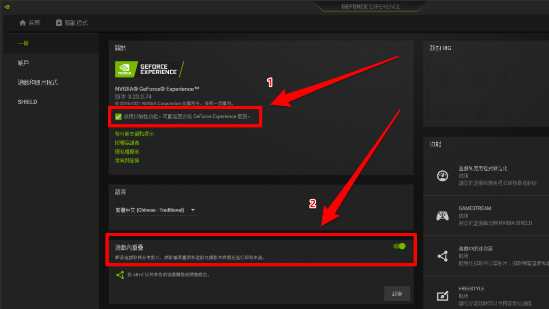 4、然后我们将下方的游戏内覆盖选项也打开。